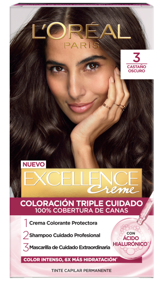 Excellence Creme de L'Oréal Paris es el tinte capilar permanente que proporciona un resultado de color perfecto y duradero con 100% cobertura de canas y triple protección. Respeta tu color, tu cabello y tu cuero cabelludo.
